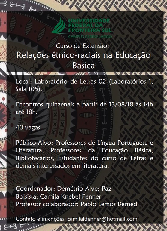 Seguem abertas, até a primeira semana de agosto, as inscrições para o curso de extensão em Relações Étnico-raciais na Educação Básica, oferecido pelo curso de Letras da UFFS – Campus Cerro Largo. O objetivo é abordar textos literários que poderão ser trabalhados nas escolas com alunos do 6º ano do Ensino Fundamental até o 3º ano do Ensino Médio no âmbito do tema relações étnico-raciais. Estão inclusos na ementa contos populares, escrita feminina e a história da literatura africana de língua portuguesa, literatura afro-brasileira e literatura indígena brasileira.