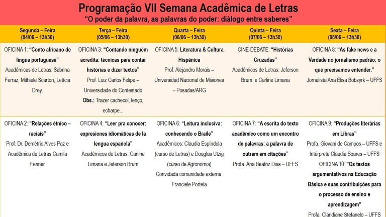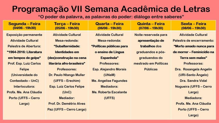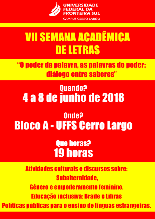 Do dia 04 a 08 de junho será realizada a VII Semana Acadêmica de Letras, com o tema: “O poder da palavra, as palavras do poder: diálogo entre saberes”. O evento objetiva a ampliação do debate acadêmico sobre temas pertinentes à cena educacional, como expressão artística e construções identitárias, discursos sobre subalternidade, Gênero e empoderamento feminino, educação inclusiva: braile e Libras, e políticas públicas para o ensino de línguas.