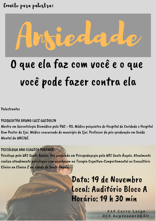 No dia 19 de novembro será realizada a palestra “Ansiedade – o que ela faz com você e o que você pode fazer contra ela”, com a psicóloga Ana Cláudia Poerner e o psiquiatra Bruno Luiz Guidolin. O evento ocorre às 19h30, no auditório do Bloco A da UFFS. As inscrições devem ser feitas no link:
