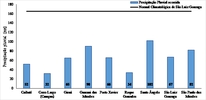 Santo Ângelo foi o local em que a chuva ocorrida foi mais próxima ao normal (62%). Em contrapartida, Cerro Largo registrou apenas 32 mm em fevereiro, o que equivale a apenas 19% da média histórica. Essa má distribuição das chuvas na região pode ter afetado a fixação de flores e o enchimento de grãos de lavouras de soja em alguns locais. Também as lavouras de milho (safrinha) em fase vegetativa podem ter sofrido perdas significativas em algumas localidades da região.