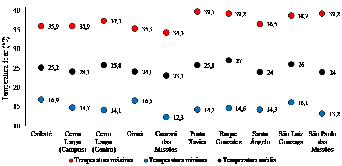 As estações meteorológicas da UFFS registraram valores elevados de temperatura do ar neste mês, chegando, em alguns locais, à marca dos 39 °C, como ocorreu em Roque Gonzales e São Paulo das Missões e Porto Xavier. (Figura 2). Esta é uma característica do clima local, agravada pela condição de La Niña, que, por proporcionar períodos secos mais frequentes, pode conduzir à períodos com maiores temperaturas do ar.