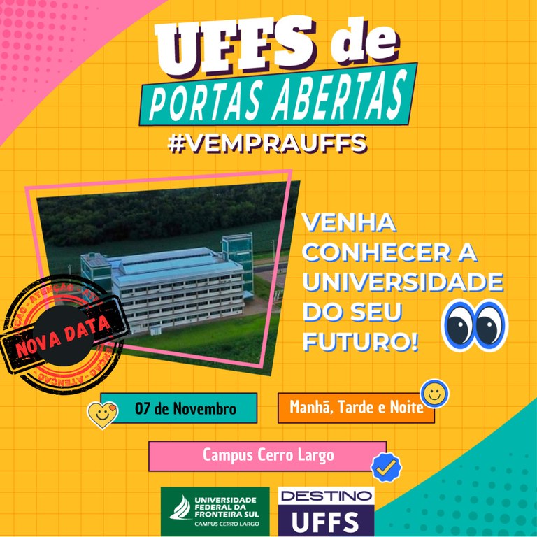 Universidade Federal da Fronteira Sul, campus Cerro Largo, se prepara para realizar o evento UFFS de Portas Abertas #VempraUFFS, agendada para o dia 07 de novembro, nos turnos manhã, tarde e noite.
