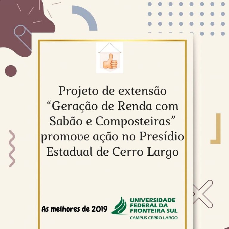 3 - Projeto de extensão “Geração de Renda com Sabão e Composteiras” promove ação no Presídio Estadual de Cerro Largo. Segundo a professora do Campus Manuela Cardoso, o objetivo da ação é “fornecer informações sobre como gerar renda a partir de produtos de baixo custo”.