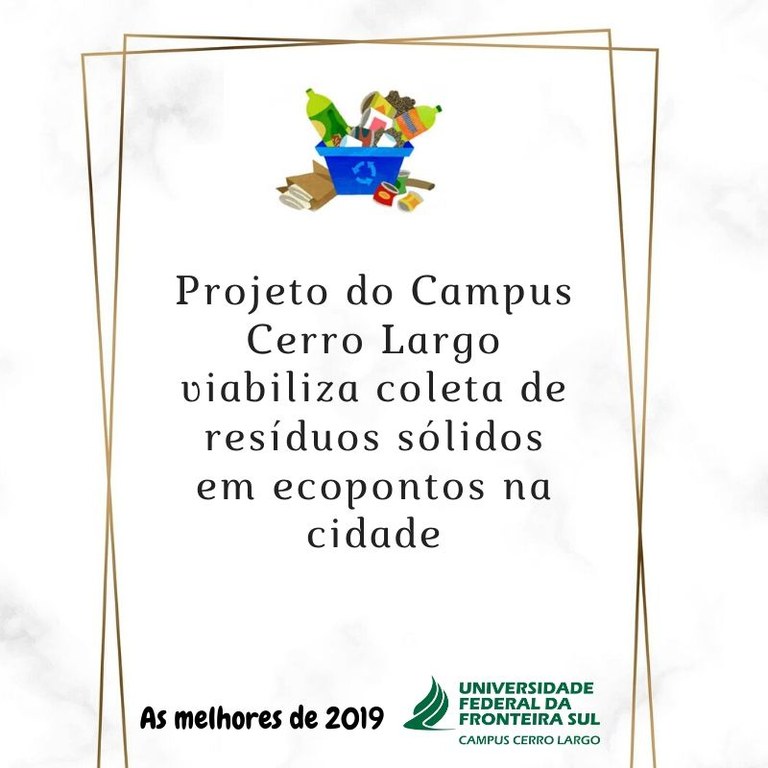 10 - Projeto do Campus Cerro Largo viabiliza coleta de resíduos sólidos em ecopontos na cidade. Os materiais recolhidos vão desde embalagens plásticas a lápis, canetas e marca-textos.