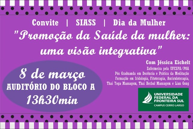 O evento, organizado pela equipe do SIASS (Subsistema Integrado de Atenção à Saúde do Servidor Público Federal) do Campus Cerro Largo, é alusivo ao Dia Internacional da Mulher e aberto a toda a comunidade acadêmica.