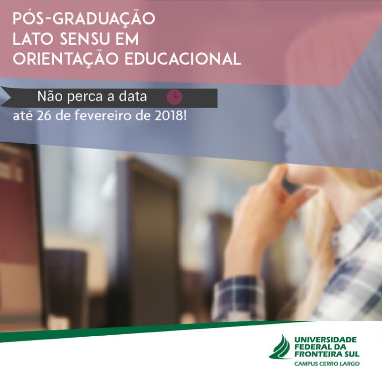 Seguem abertas, até o dia 26 de fevereiro, as inscrições para o curso de Especialização (Lato Sensu) em Orientação Educacional oferecido na UFFS – Campus Cerro Largo. São ofertadas 35 vagas na modalidade presencial para ingresso em março de 2018 e término previsto para outubro de 2019, totalizando 440 horas.As inscrições devem ser feitas de segunda a sexta-feira, exceto feriados, das 8h30 às 11h30 e das 13h30 às 16h30, na Secretaria dos Cursos de Pós-graduação, na Unidade Seminário (rua Major Antônio Cardoso, 590, sala 1-2-16). Podem ser feitas pessoalmente ou por meio de procuração reconhecida em cartório.
