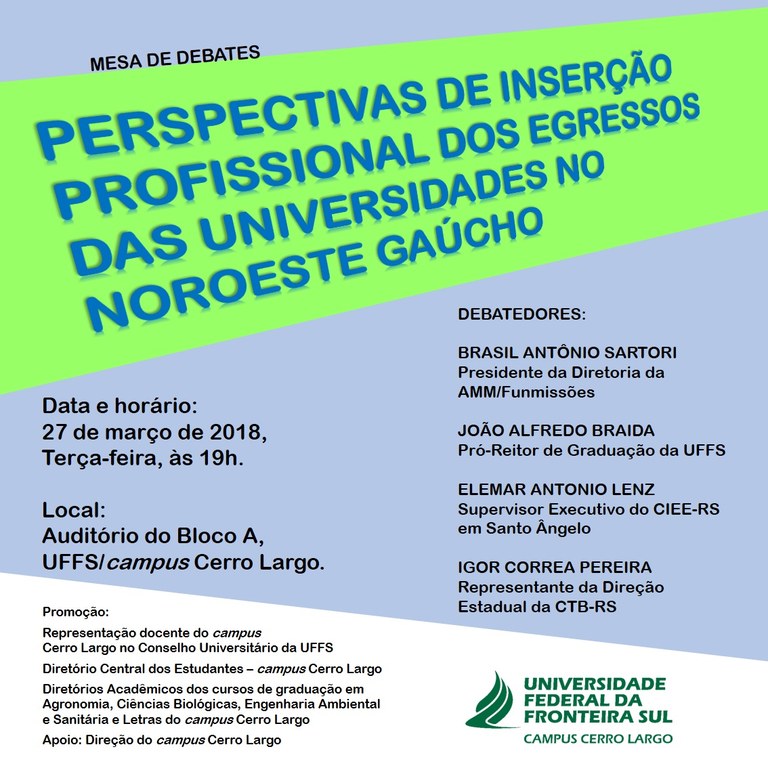 Para refletir sobre o assunto, será realizada a mesa de debates “Perspectivas de inserção profissional dos egressos das universidades no noroeste gaúcho”, coordenado pelo professor. Estão confirmados os seguintes convidados: o presidente da Diretoria da AMM/Funmissões, Brasil Antônio Sartori, o pró-reitor de Graduação da UFFS, João Alfredo Braida, o supervisor executivo do CIEE – RS em Santo Ângelo, Elemar Antonio Lenz e o representante da Direção Estadual da CTB (Central de Trabalhadores e Trabalhadoras do Brasil) – RS, Igor Correa Pereira.