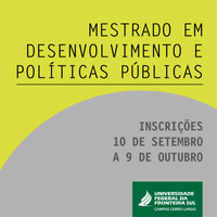 Estão abertas as inscrições para o processo seletivo do curso de Mestrado do Programa de Pós-Graduação em Desenvolvimento e Políticas Públicas (PPGDPP), oferecido na UFFS – Campus Cerro Largo, para ingresso em 2019.1.