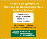 No próximo dia 19 será realizada a palestra “Vivência de Egressos do Mestrado em Desenvolvimento e Políticas Públicas”, promovido pelo próprio Programa. O objetivo é oportunizar a troca de experiências entre ex-mestrandos e os estudantes atuais do curso. Os palestrantes e ex-alunos do Mestrado que vão relatar suas vivências durante o curso são Jorge Adalberto Schommer, Josnei Machry Weber e Mauro André Leschko.