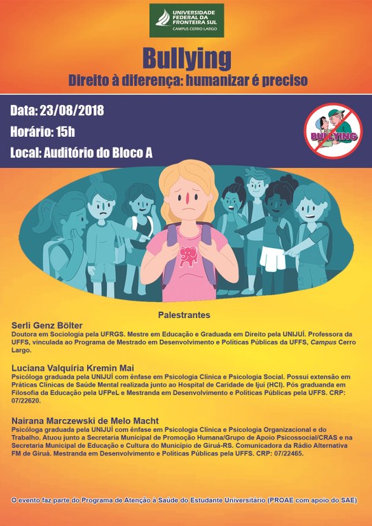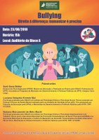 Nesta quinta-feira (23) será realizada a palestra intitulada “Bullying – Direito à diferença: humanizar é preciso", ministrada pela professora Serli Bolter e pelas psicólogas Luciana Mai e Nairana de Melo Macht. O evento inicia às 15h, no auditório do Bloco A.