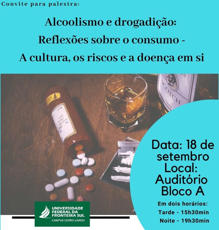 A palestra “Drogadição e Alcoolismo: reflexões sobre o consumo – a cultura, os riscos e a doença em si” ocorrerá na próxima terça-feira (18) na UFFS – Campus Cerro Largo, com a psicóloga Thaís Vargas Pereira, especialista em Dependência Química pela UNIFESP.