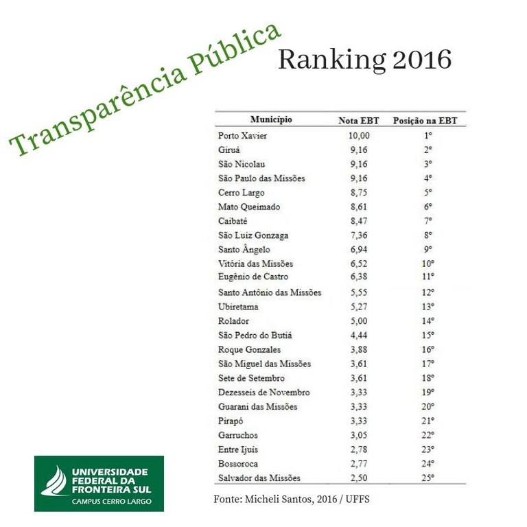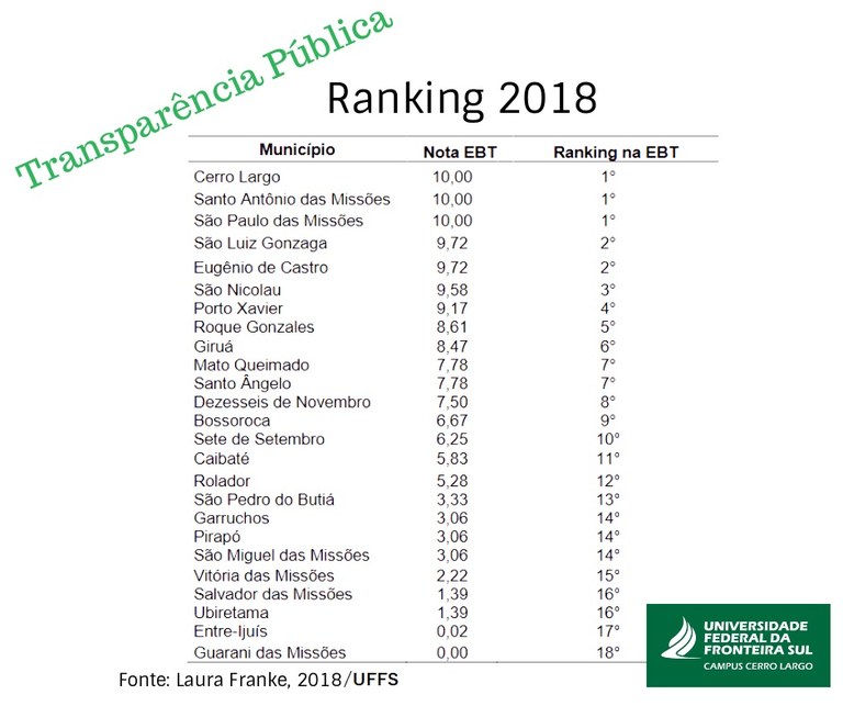 Esses estudos foram realizados, respectivamente, pela então estudante de Administração e hoje mestranda do Programa Desenvolvimento e Políticas Públicas (PPGDPP) da UFFS – Campus Cerro Largo Laura Franke, que avaliou os portais eletrônicos dessas prefeituras em seu Trabalho de Conclusão de Curso (TCC), em 2018, e pela mestra no mesmo Programa e técnica administrativa da UFFS Micheli dos Santos, em 2016. Elas apresentaram esses dados no Seminário de Socialização sobre o Cenário da Transparência Pública Municipal na Região das Missões (RS) que ocorreu no dia 18 de junho na Universidade, durante atividade do projeto de extensão “Orçamento Público e Responsabilidade Fiscal: abordagem para transparência e controle social”, coordenado pelo professor Ari Söthe.