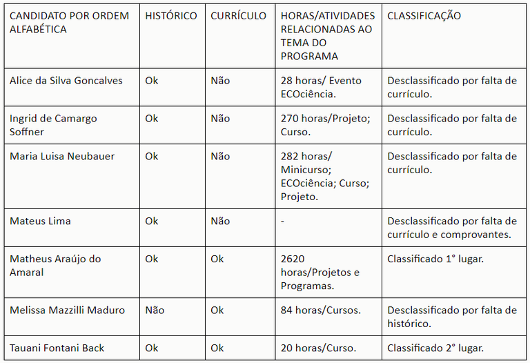 O Programa de Extensão “Gestão dos Resíduos, Sustentabilidade e Educação Ambiental na Região das Missões do Rio Grande do Sul”, sob coordenação da professora Manuela Gomes Cardoso, torna público o resultado parcial do processo seletivo para bolsista.