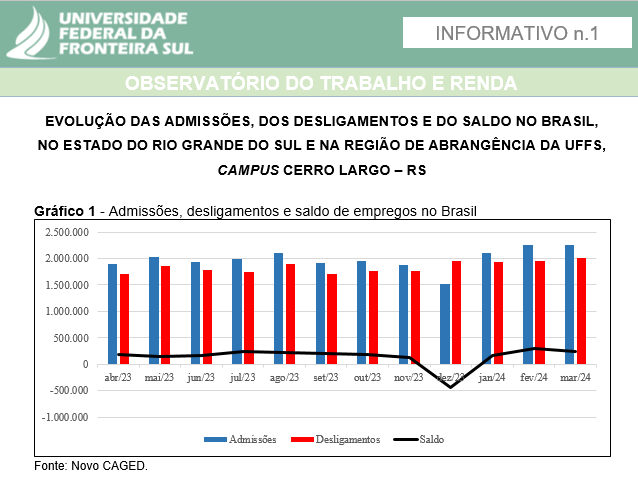 - A região de abrangência da UFFS Campus Cerro Largo – RS, gerou 276 novos postos de trabalho no primeiro trimestre de 2024, com um total de 1.254 admissões e 978 desligamentos;