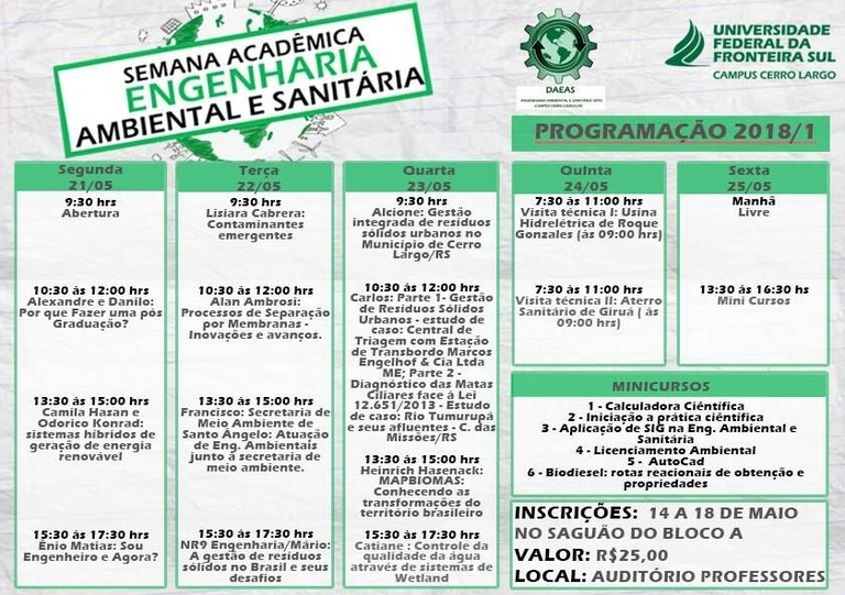 Estão abertas as inscrições para a VII Semana Acadêmica de Engenharia Ambiental e Sanitária da UFFS – Campus Cerro Largo. As inscrições seguem até sexta-feira (18) e podem ser feitas no saguão do Bloco A.
