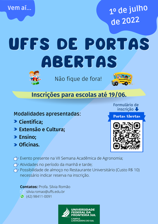 Mais informações sobre a Semanagro em https://doity.com.br/semanagro ou com o estudante Giovani Medeiros dos Santos, no telefone (42) 99943-4445. Informações sobre o evento UFFS de Portas Abertas com a professora Silvia Romão no e-mail silvia.romao@uffs.edu.br ou no telefone (42) 98411-0091.