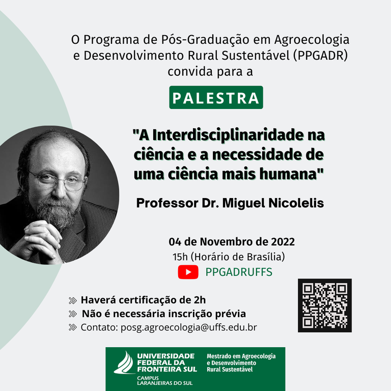 O Programa de Pós-graduação em Agroecologia e Desenvolvimento Rural Sustentável (PPGADR) da UFFS - Campus Laranjeiras do Sul promove a palestra “A interdisciplinaridade na ciência e a necessidade de uma ciência mais humana”, que será proferida pelo professor Miguel Nicolelis.