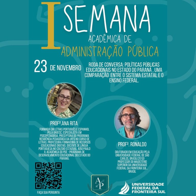 Nos dias 23 e 24 de novembro, será realizada a I Semana Acadêmica do Curso de Administração Pública da Universidade Federal da Fronteira Sul (UFFS) – Campus Realeza. O objetivo é discutir as políticas públicas envolvidas nos aspectos educacionais, tanto do ensino superior como da educação básica, além da importância dos direitos humanos na democracia.