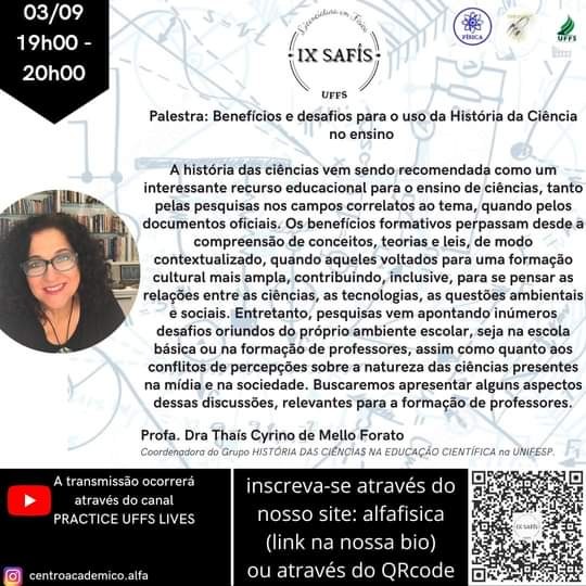 O encerramento será no dia 3 de setembro, quando será abordado os “Benefícios e desafios para o uso da História da Ciência no ensino”. A palestra será proferida pela professora Thaís Cyrino de Mello Forato, que atua na Universidade Federal de São Paulo (UNIFESP). A convidada desenvolve pesquisas envolvendo interfaces entre a História das Ciências, a Educação Científica, a Formação de Professores e a Divulgação da História das Ciências.