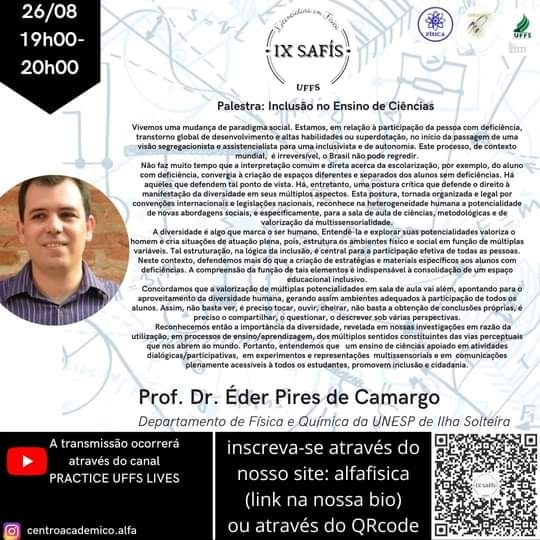 Nesta quinta-feira (26), às 19 horas, o evento traz a palestra “O Ensino de Física na perspectiva da Educação Inclusiva: desafios presentes no cenário educacional brasileiro”, com o professor Éder Pires de Camargo, do Departamento de Física e Química da Universidade Estadual Paulista (UNESP). A temática reflete sobre práticas que promovam a inclusão e a cidadania a partir de “um ensino de ciências apoiado em atividades dialógicas/participativas, em experimentos e representações multissensoriais e em comunicações plenamente acessíveis a todos os estudantes”.