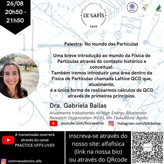 No horário das 20h50, inicia a palestra “No mundo das partículas”, com a pesquisadora Gabriela Bailas, que atualmente trabalha no High Energy Accelerator Research Organization (KEK), em Tsukuba, no Japão. Além de abordar o contexto histórico e conceitual sobre partículas elementares e a interação entre elas, a palestrante também irá apresentar uma área dentro da Física de Partículas chamada Lattice QCD.