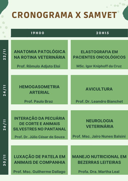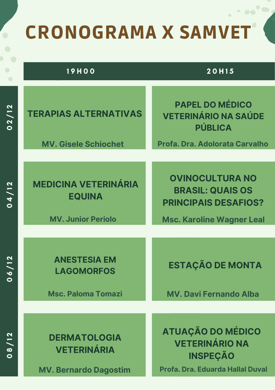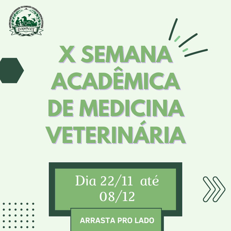 As atividades da X Semana Acadêmica de Medicina Veterinária da UFFS iniciam no dia 22 de novembro e serão finalizadas no dia 8 de dezembro. A organização é do Diretório Acadêmico de Medicina Veterinária (DAMVET), em parceria com a Coordenação do curso.